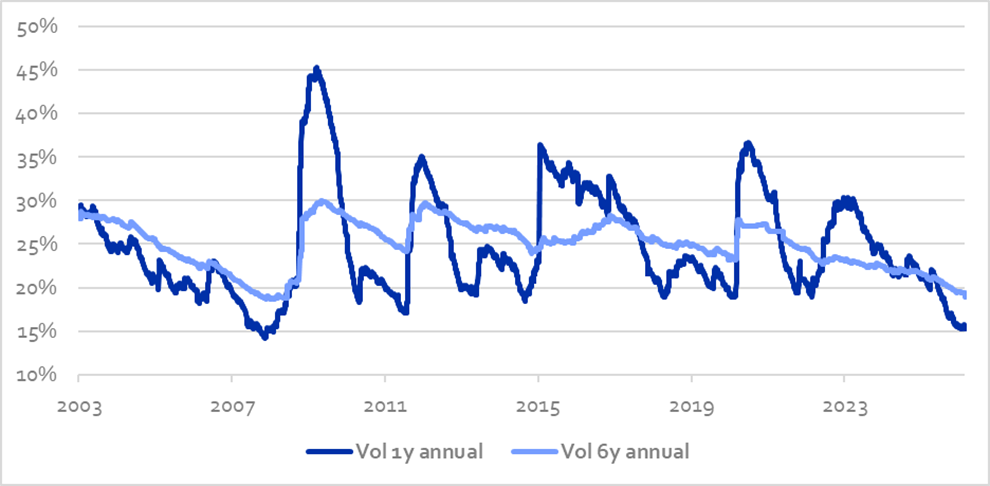 La prima misura (volatilità annualizzata a 1 anno) si basa su una matrice di covarianza a breve termine e può essere vista come una proxy del quadro di rischio tipicamente adottato dagli investitori più speculativi. La seconda misura (volatilità annualizzata a 6 anni) si basa su un orizzonte temporale più lungo e incorpora una metodologia di ponderazione esponenziale, in base alla quale le osservazioni più vecchie vengono effettivamente dimezzate ogni due anni, ponendo così maggiore enfasi sui dati recenti. Questo approccio funge da proxy per i modelli di rischio generalmente utilizzati dai gestori attivi e dagli investitori istituzionali.